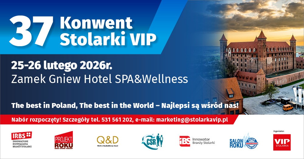 W tym kontekście nadchodzący 37. Konwent Stolarki VIP, który odbędzie się w dniach 25–26 lutego 2026 roku na Zamku w Gniewie, staje się wydarzeniem obowiązkowym dla liderów branży. To tutaj porozmawiamy o zmianach, wyzwaniach, konsolidacjach, sukcesjach i konkurencji – zarówno krajowej, jak i międzynarodowej.