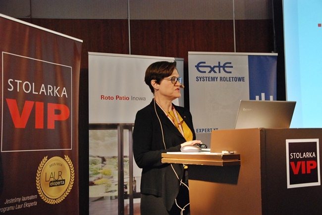 Jednym z głównych tematów, prezentowanych przez ekspertów Roto w części panelowej był rozwój branży okien i drzwi na świecie i w Europie, w perspektywie aktualnej sytuacji rynku budowlanego i prognoz. Jak pokazują dane Eurostatu, budownictwo w krajach europejskich utrzymuje trend wzrostowy. W 2019 roku sektor osiąga poziom 2% powyżej wzrostu w całej gospodarce. „Dogodne warunki finansowania zakupu mieszkań, dobra sytuacjia na rynku pracy, zmiany demograficzne i rosnące przychody gospodarstw domowych pozwalają naszej branży optymistycznie patrzeć w przyszłość” – mówiła Barbara Ahlers, prezes Roto Frank Okucia Budowlane. Zdaniem ekspertów Roto w przyszłości okna staną się usługą. Użytkownik wraz produktem otrzyma dodatkowe korzyści: komfort, bezpieczeństwo, energooszczędność czy inteligentne technologie zintegrowane w systemach Smart Home. Przewidywane zmiany na światowych rynkach omawiane były na przykładzie rynku niemieckiego, który przechodzi silne przeobrażenia. „Konsolidacja w kierunku dużych zindustrializowanych firm o samosterującej produkcji oraz digitalizacja całego łańcucha wartości eliminowanie czynności administracyjnych – to obecnie jedne z najwyraźniejszych tendencji na rynku niemieckim” – mówiła Barbara Ahlers (na zdjęciu poniżej).