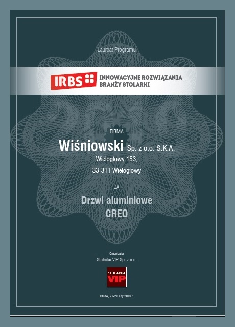 Aluminiowe drzwi zewnętrzne CREO, firmy Wiśniowski to Produkt wyróżniony w Programie IRBS – Innowacyjne Rozwiązania Branży Stolarki.