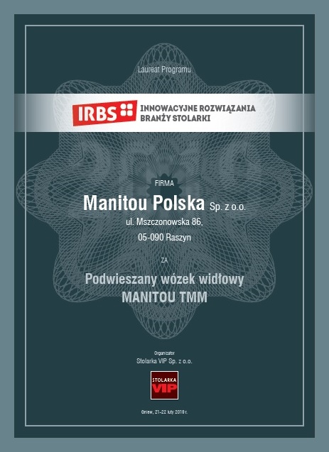 Firma Manitou została Laureatem Programu Innowacyjne Rozwiązania Branży Stolarki, wyróżniona za Podwieszamy Wózek Widłowy MANITOU TMM.Grupa Manitou jest jednym z ważniejszych światowych koncernów w branży budowy maszyn. Specjalizuje się w produkcji ładowarek teleskopowych i terenowych wózków widłowych, lecz zakres jej produkcji jest dużo większy.