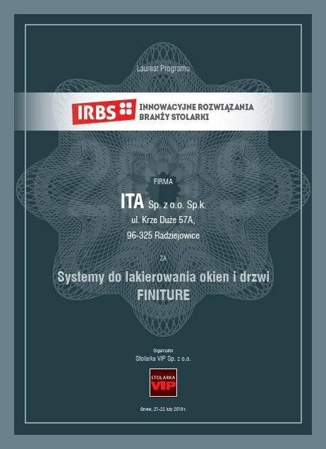 Firma ITA została wyróżniona w Programie IRBS – Innowacyjne Rozwiązania Branży Stolarki za zintegrowany system do lakierowania okien i drzwi FINITURE.