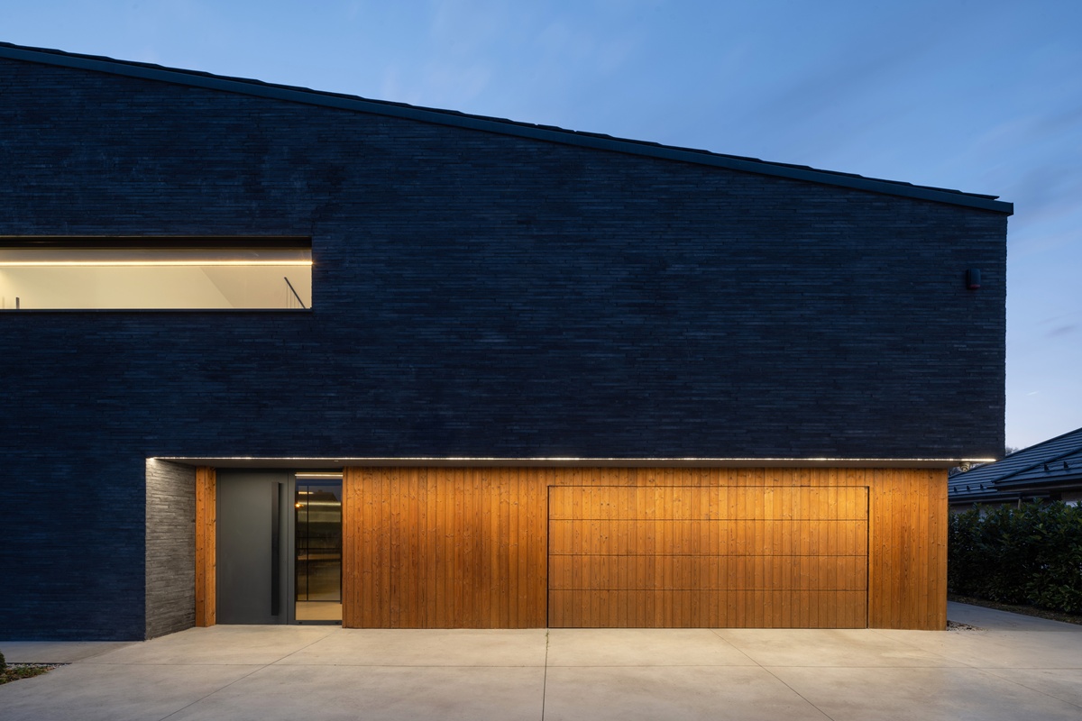 M.K.: Zaproponowane rozwiązanie z bramą ukrytą, elewacyjną obłożoną drewnem palonym, tym samym co na reszcie domu, podkreśla minimalistyczny charakter bryły. Z daleka widzimy jednolity monolit zlicowanego drewnianego “boxa” akcentującego strefę wejściową domu, dopiero z bliska można dostrzeć podziały technologiczne segmentowej bramy. Wspólnie z Inwestorem nie chcieliśmy, by brama garażowa zdominowała elewację frontową i odcinała się wizualnie wielką antracytową płaszczyzną od drewnianego wykończenia.