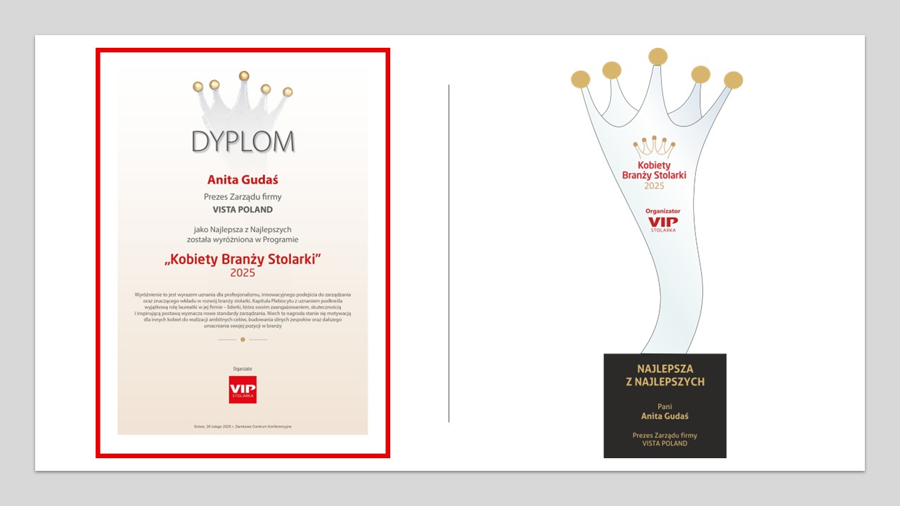Anita Gudaś: Przy okazji chciałabym jeszcze raz serdecznie podziękować Kapitule Plebiscytu oraz wszystkim, którzy na mnie głosowali. Znalezienie się w gronie laureatek plebiscytu „Kobiety Branży Stolarki” jest dla mnie ogromnym wyróżnieniem. Jestem wdzięczna za docenienie mojej pracy. Jednak nie mogłabym niczego osiągnąć bez zespołu, który współtworzy Vista Poland Sp. z o.o. W tym miejscu chciałabym podziękować pracownikom za ich zaangażowanie i ogromny wkład w rozwój firmy przez te lata. Zależy mi, aby czuli się w pracy jak w rodzinie i nadal wiązali z nami swoją przyszłość.