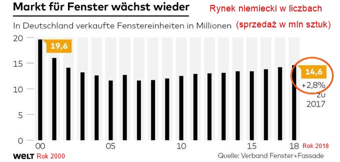Można jeszcze dodać, że polskie okna i drzwi stanowią już prawie 20% niemieckiego rynku stolarki, a może być jeszcze lepiej, gdyż eksport rośnie i przyśpiesza. W roku 2018 sprzedaż okien w Niemczech wyniosła prawie 15 mln sztuk i była wyższa o prawie 3% niż w roku 2017 (patrz wykres). Tutaj link do salonu VIP, można także obejrzeć sobie film i pospacerować: https://www.fenstermaxx24.com/showroom/