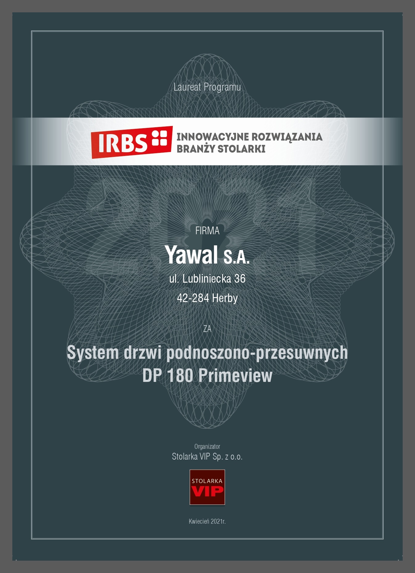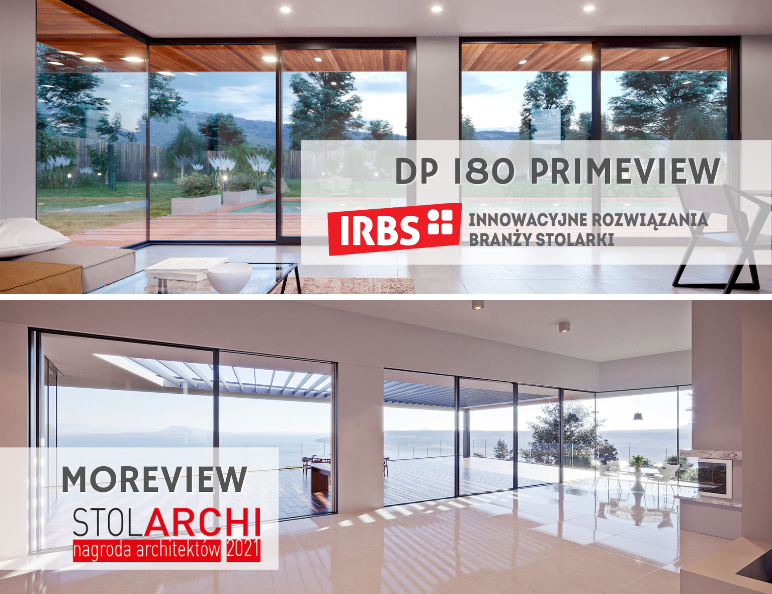 Laureatem programu IRBS został z kolei system drzwi podnoszono-przesuwnych DP 180 Primeview. Program IRBS raz w roku w sposób szczególny wyróżnia te najbardziej innowacyjne rozwiązania, które są dostępne w Polsce, Europie i na świecie. IRBS to jedyny program w branży stolarki, który ocenia i docenia producentów maszyn, komponentów, systemów, programów IT, elementów do montażu i akcesoriów. Organizatorem plebiscytu jest Stolarka VIP.