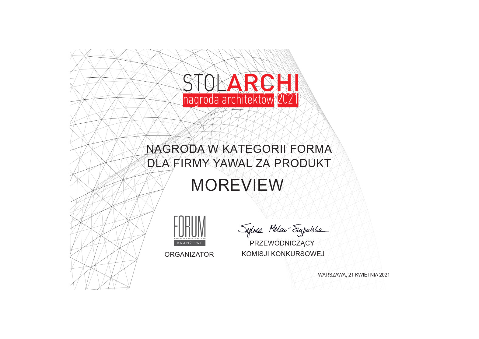 W ramach StolArchi 2021 decyzją niezależnej komisji złożonej z topowych architektów, którym przewodniczyła pani Sylwia Melon-Szypulska system MOREVIEW otrzymał I nagrodę w Kategorii Forma. StolArchi 2021 to prestiżowy polski konkurs, w którym praktycy z biur projektowych wybierają najlepsze produkty z branży stolarki budowlanej. Są oni w stanie najlepiej docenić zarówno walory estetyczne, jak i funkcjonalne poszczególnych wyrobów, gdyż w swoich projektach na co dzień korzystają z wielu rozwiązań okiennych czy drzwiowych. Nie bez znaczenia w ich codziennej pracy jest również wsparcie techniczne, na jakie mogą liczyć ze strony producentów stolarki na różnych etapach projektowania budynków.