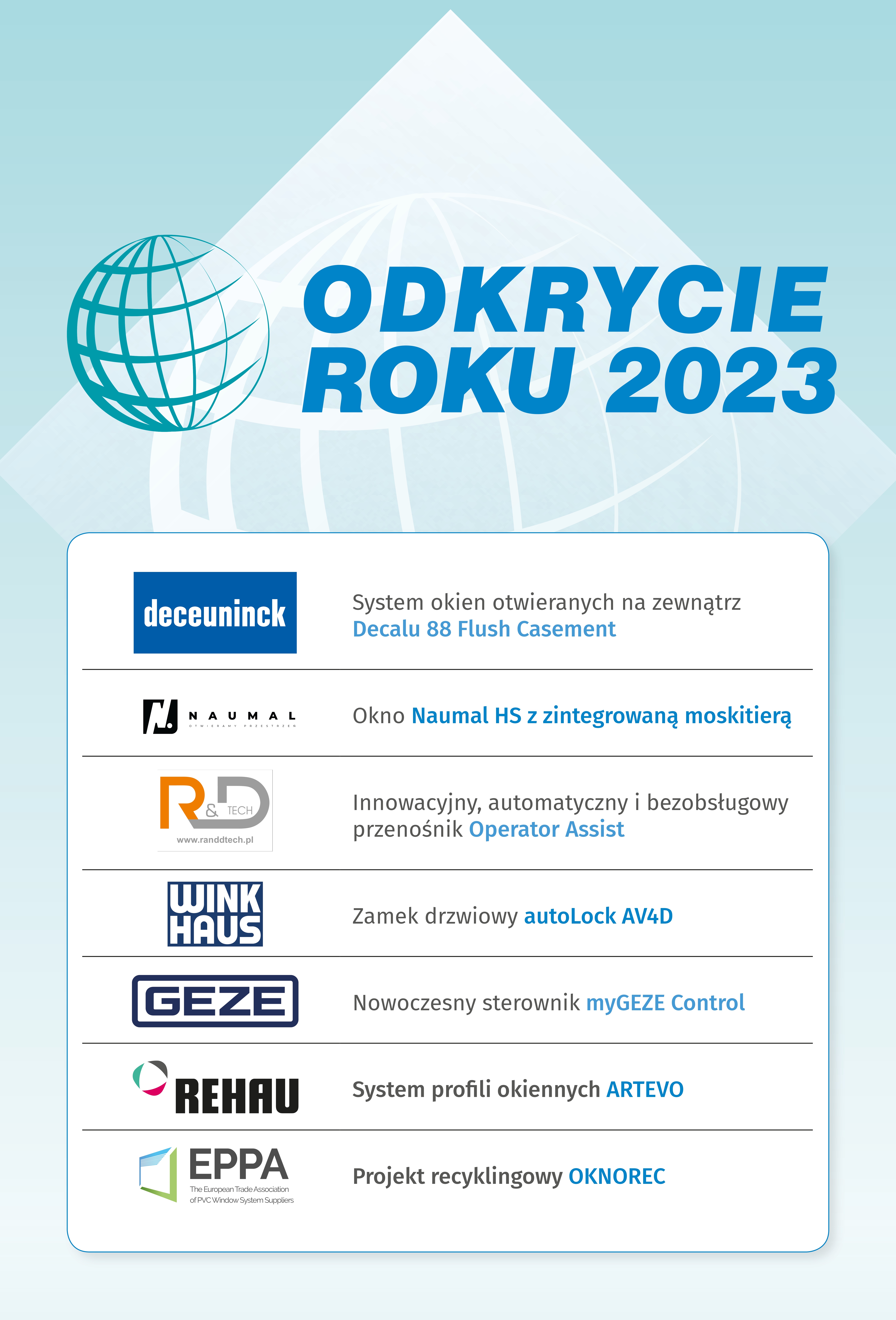 Program „Odkrycie Roku” dla branży stolarki otworowej udowadnia, że przyszłość należy do tych, którzy myślą odważnie i działają kreatywnie. Niech to wyróżnienie będzie inspiracją dla tych wszystkich, którzy pragną podążać za innowacyjnymi ścieżkami i zmieniać świat wokół nas. Wkrótce stolarka otworowa znów zaskoczy nas nowymi technologiami i jeszcze większymi możliwościami. Niech ta nagroda będzie dla nas przypomnieniem, że nigdy nie powinniśmy spoczywać na laurach, tylko ciągle poszukiwać kolejnych innowacji, które czekają na nas tuż za rogiem, ale to już w 2024 r.